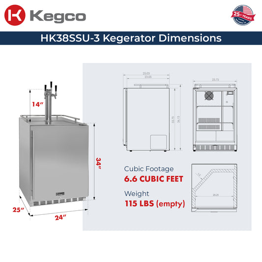 Kegco 24" Wide Outdoor Triple Tap All Stainless Steel Built-In Right Hinge Kegerator with Kit