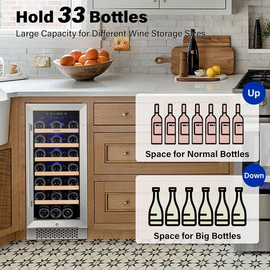 Yeego 15 Inch Wide 33 Bottle Narrow Small Wine Fridge, Under Counter, Built-In or Freestanding